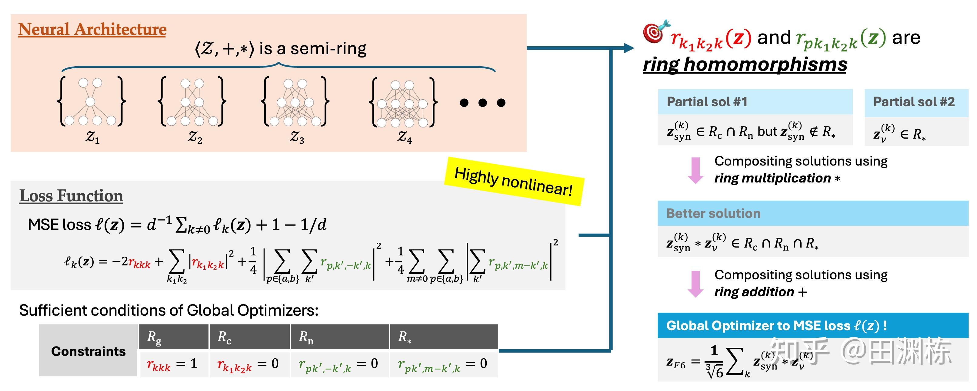 文章的思路非常直接:首先,我们发现不同大小的两层神经网络的解空间放在一起,满足一个半环的结构;其次,目标函数(MSE Loss)可以展开为一些项的平方和,其中每个项都是从这个半环到复数域上的同态映射。这样的话,如果要找到这个目标函数的全局最优解,那完全可以把每个项单独拿出来,找各自的最优解,然后把这些各自的最优解用半环上的运算(也即是半环上的加法和乘法)拼起来,变成全局最优解。