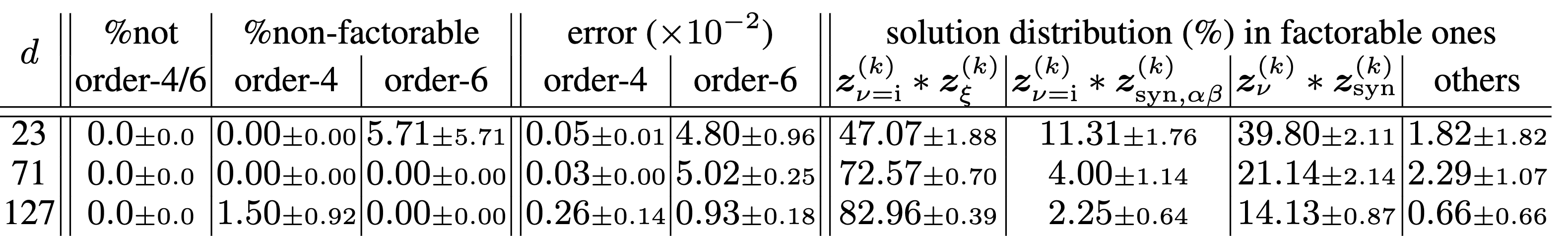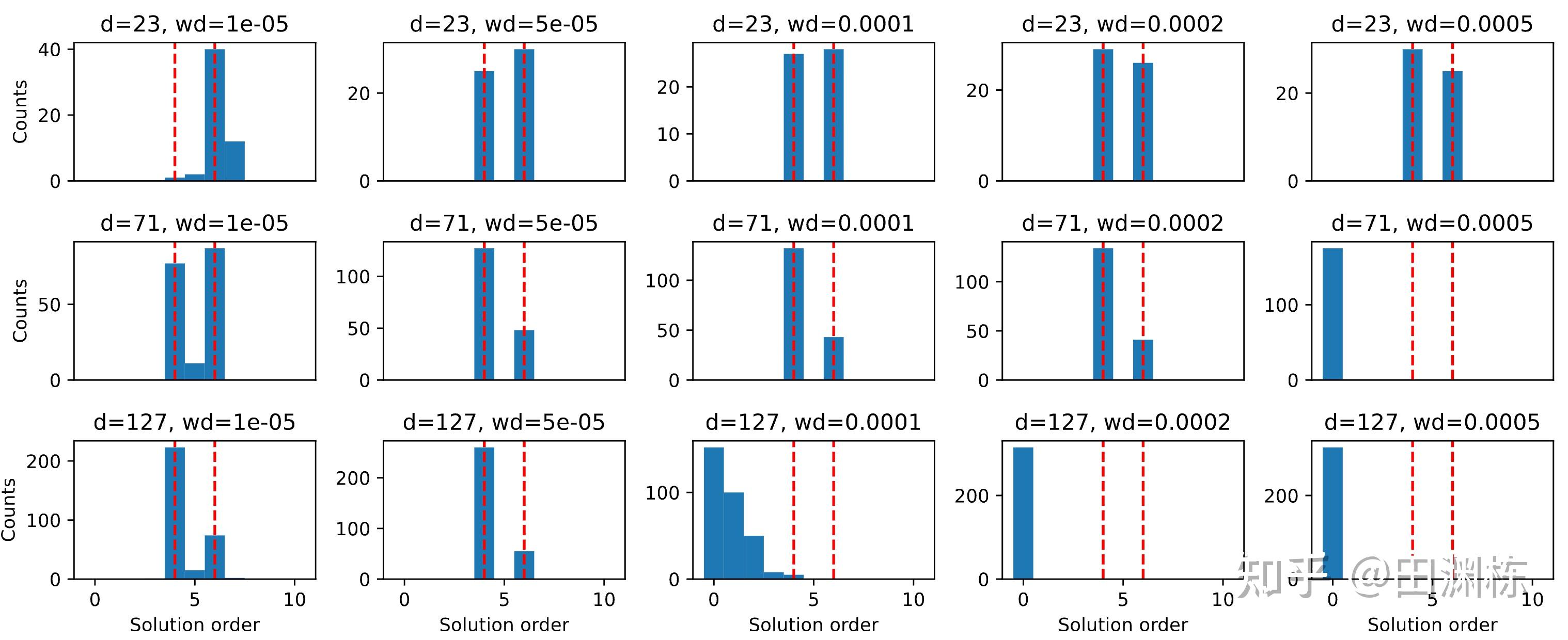这样就把“用2层神经网络拟和取模加法”这个任务里的解空间结构,较为完整地刻画下来了。当然构造最优解这本身并不稀奇,大量过往的文章都可以做到这一点,但在构造完了之后,我们进一步发现,这些构造解,和真的用Adam梯度下降跑出来的,完全一致。具体来说,不管中间层的神经元有多少个,过参化的程度如何,在梯度下降收敛时,最终每个频率上存在阶为4的解和阶为6的解(“阶“指的是这个解由多少个神经元共同组成),并且在这些解中,有95%的解还能按照半环的乘法分解成“2x2”和“2x3”的形式,并且每个部分都能对上理论的构造。